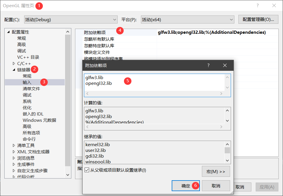 (5) 接下来依旧在属性页,链接器 > 输入 > 附加依赖项 > 编辑,添加下面两个依赖库
