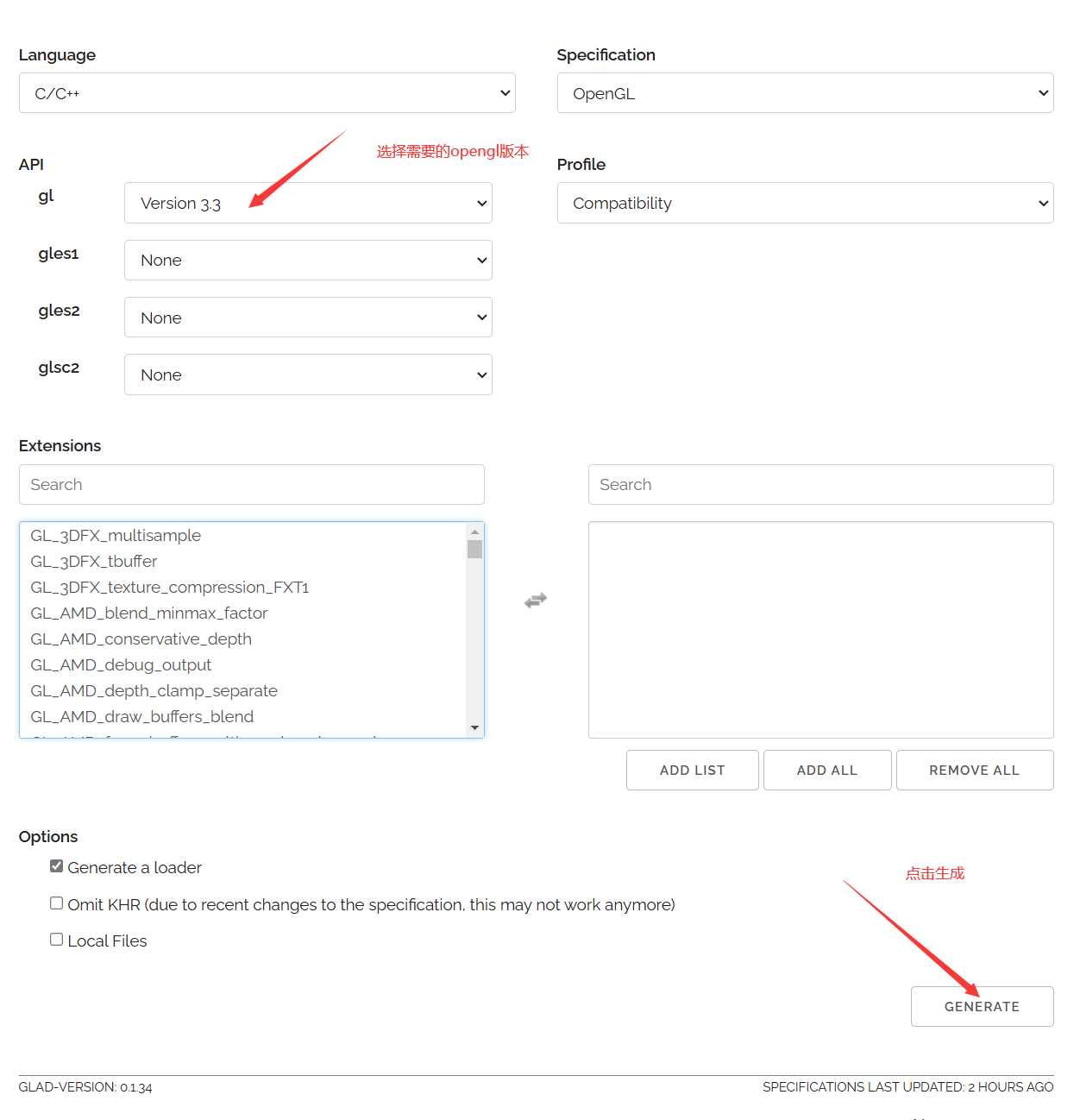 (3) 进入GLAD在线配置地址,选择好语言及opengl版本,这里选择3.3,目前显卡基本都支持。下载完后文件夹中只有一个src和一个include