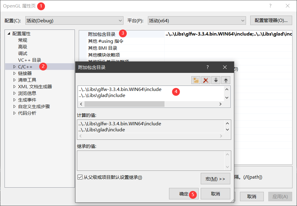 (4) 打开VS并新建C++空项目,打开项目属性 > C/C++ > 附加包含目录 > 编辑,在目录下添加glfw和glad的include目录(这边是我自己的相对目录,实际按自己的目录来配置)