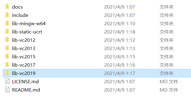 (2) 从GLFW官网下载库文件,解压后如图,我们使用的是VS2019,所以下面配置库时使用lib-vc2019中的库文件