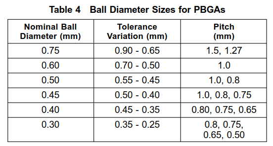 下面几个表是摘处IPC7095,其中Table5使用得稍微少一些,主要还是PITCH=0.4mm的情况,0.30和0.25使用得不多,主要是很多代工厂做不了PITCH小于0.4mm的情况。一般只有大厂家,便携式设备才会用到。所以我们主要看table 4和table 6。