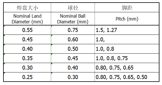 比如PITCH=0.5mm,根据表4,球径(nominal ball diameter)=0.3mm,再对应到表6,焊盘直径(Nominal land diameter)为0.25mm。据此,我做了下面这个《BGA焊盘直径与脚距的关系》,