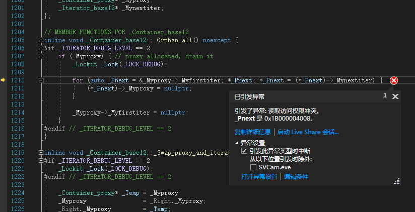 VisualStudio2019的怪问题,在_Container_base12::_Orphan_all引发了异常: 读取访问权限冲突