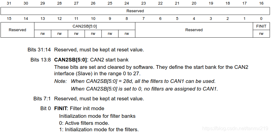 如果CAN2SB=0,就表示28个过滤器全部分配给CAN2,因为最小序号0的过滤器分配给了CAN2,后续也只能连续地分配给CAN2。