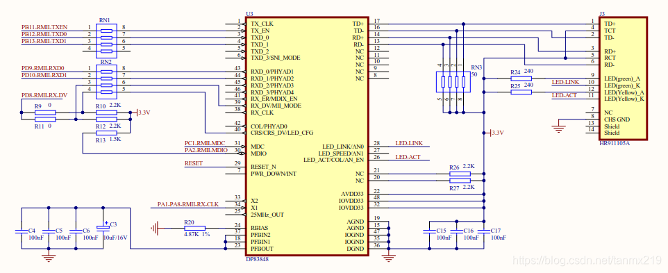 下面这个是手册中推荐的DP83848电路