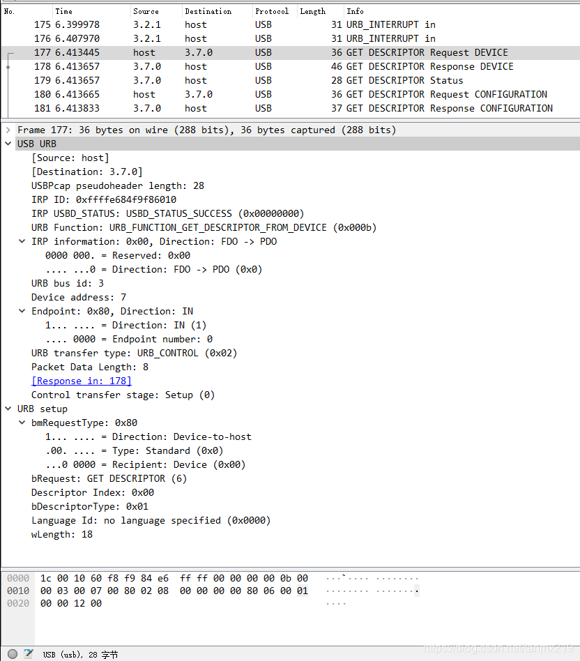 这个例子里面,USB URB 就是这个Pseudoheader,占0x1C=28个字节,后面的80060001 00001200才是真正发送的内容,也就是URB setup。