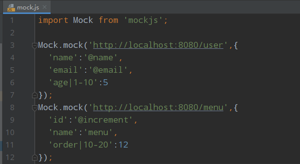 2、安装完成之后再src下新建mock目录,创建 mock.js文件,在里面我们模拟了两个接口,分别拦截用户和菜单的请求,并返回响应的数据,mock文件中代码如下: