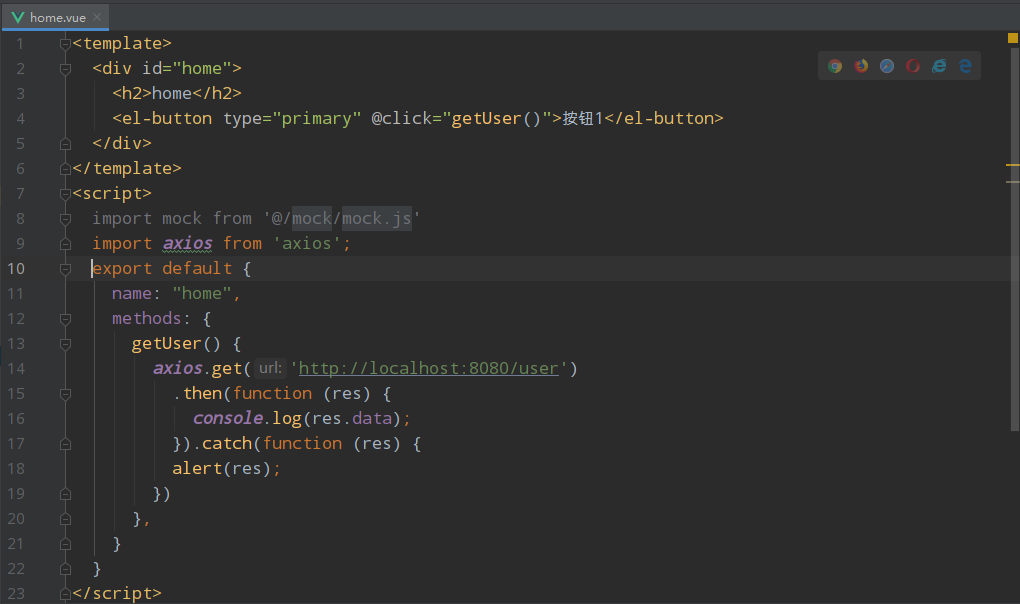 4、浏览器访问:http://localhost:8080/#/,分别点击两个按钮,mock 会根据请求 url 拦截对应请求并返回模拟数据。