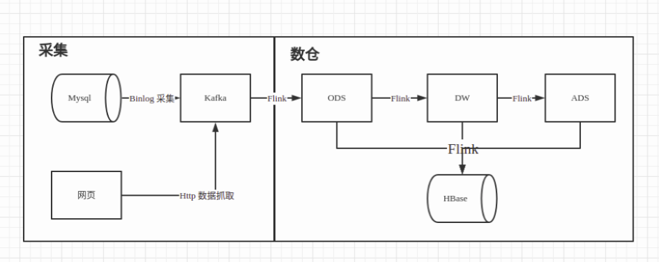 Flink 读取 DW 中的数据,计算业务指标后写入 ADS 层(Kafka),同时起一个 Flink 任务,将 DWD 的数据写一份到 Hbase