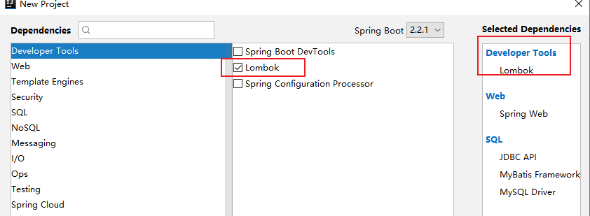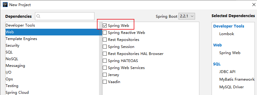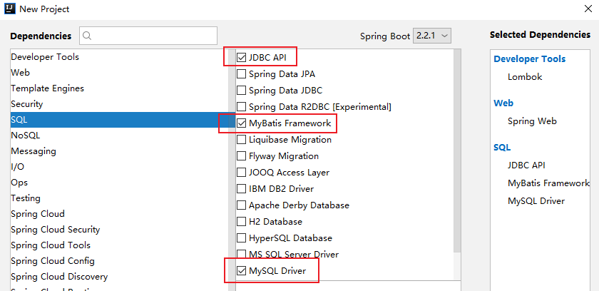 选择Lombok、spring web、JDBC API、Mybatis framework、MySQL Driver然后下一步