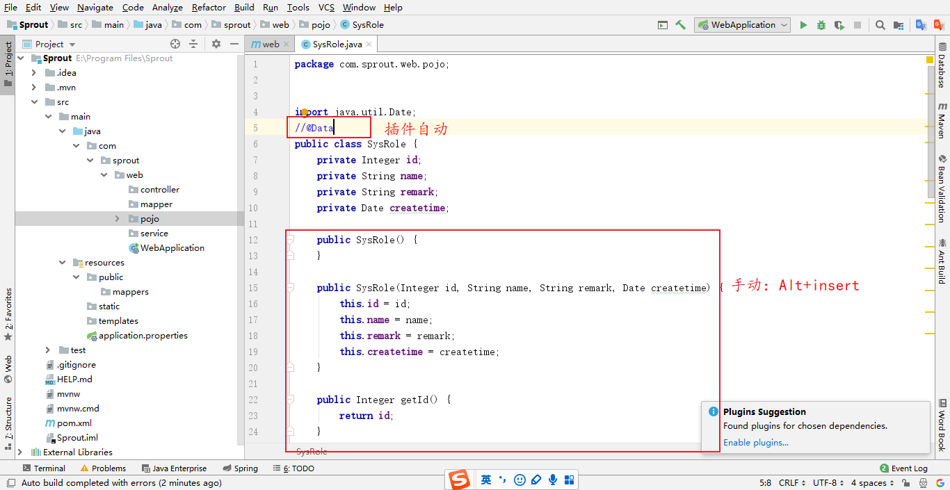 也可以用@Data(在开始勾上Lombok就这个注解用的,但是我是手动)