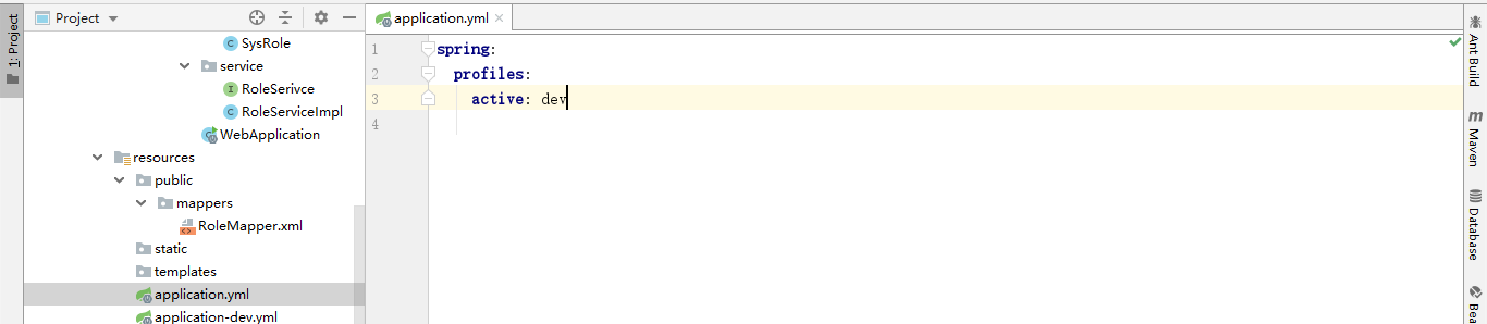 在resources下面删除application.properties(可以用,我习惯用yml格式),新建俩个yml文件配置文件配置application-dev.yml(开发配置)