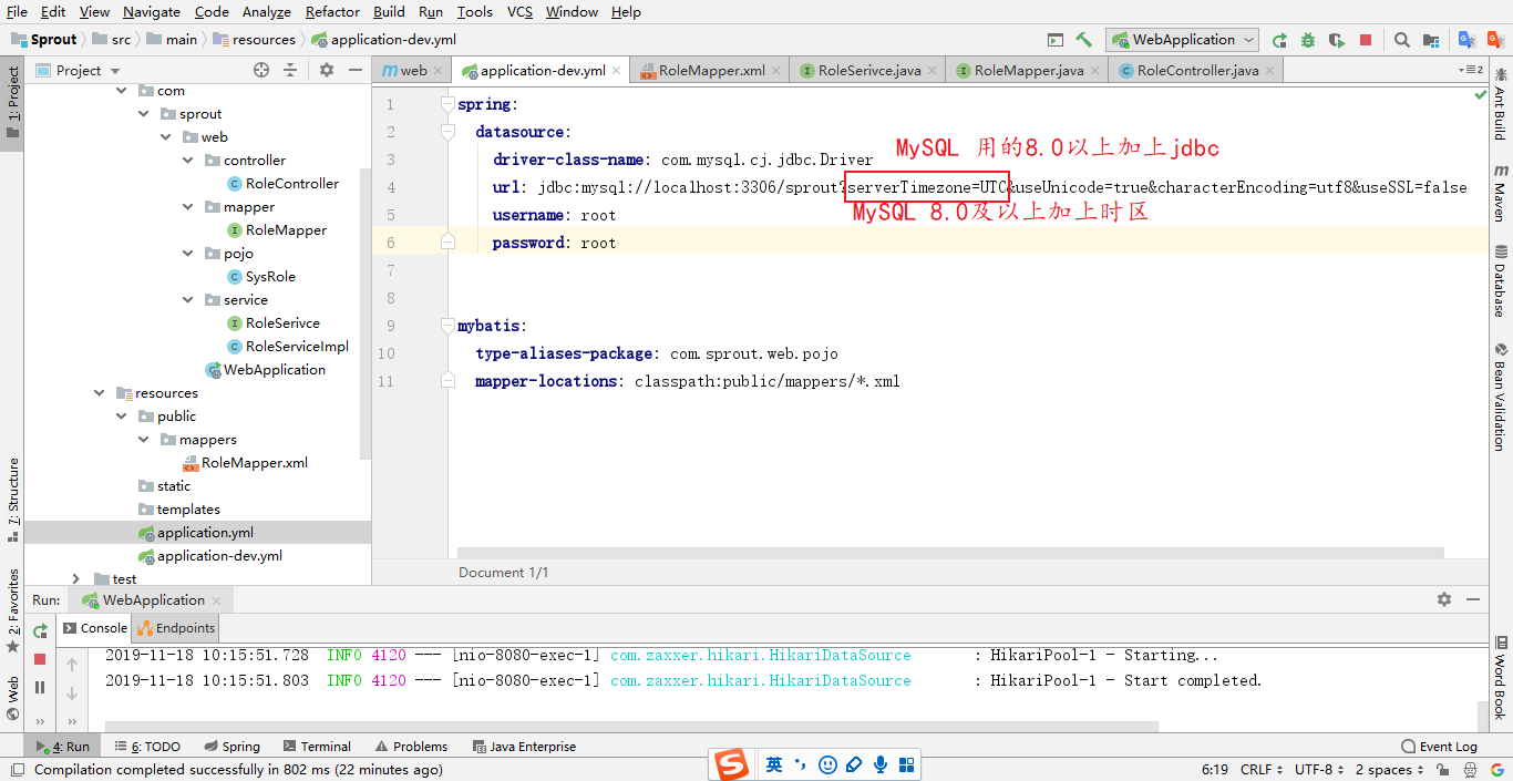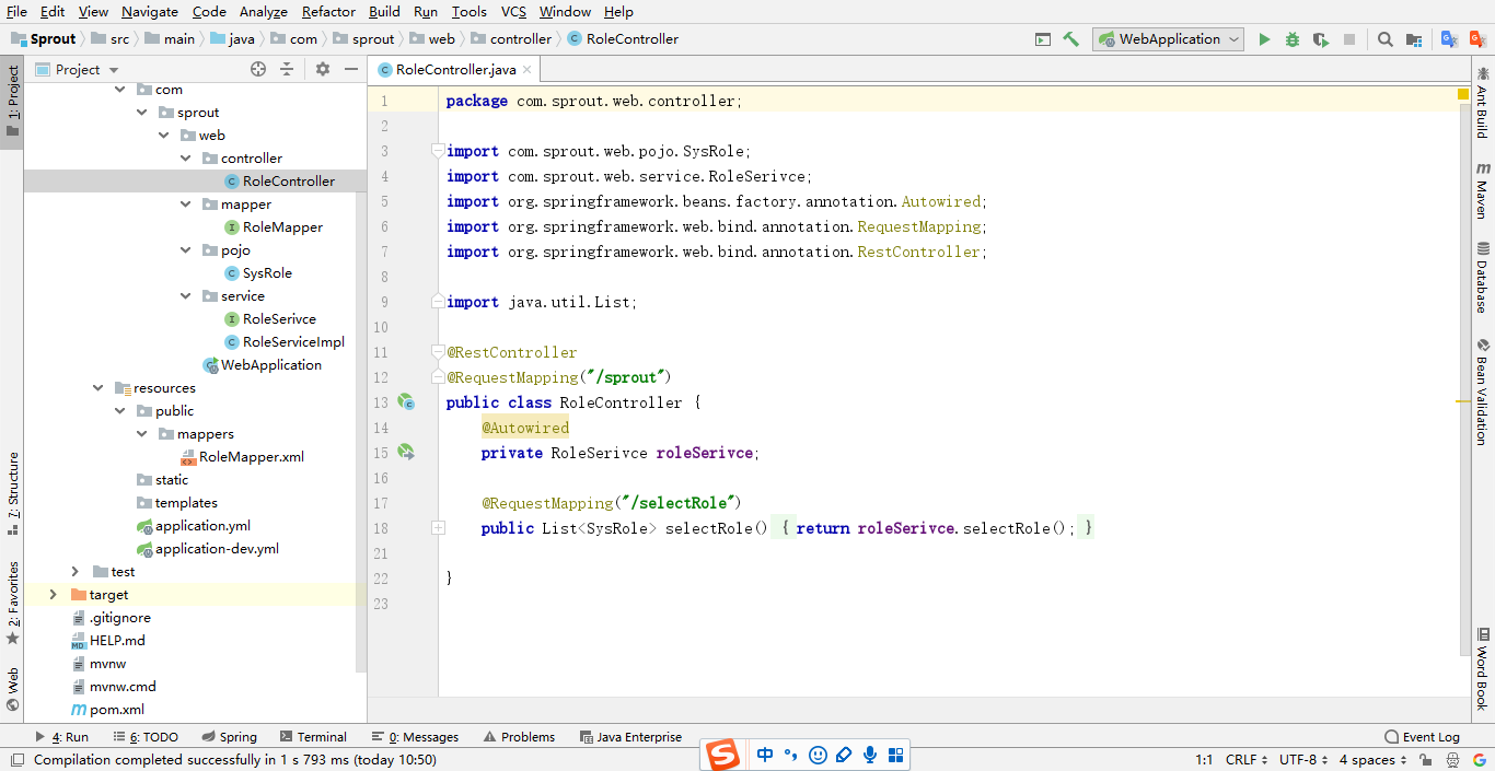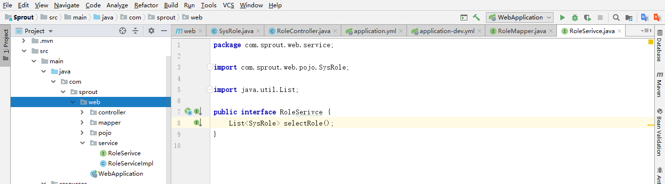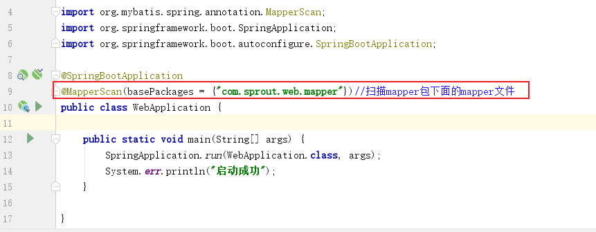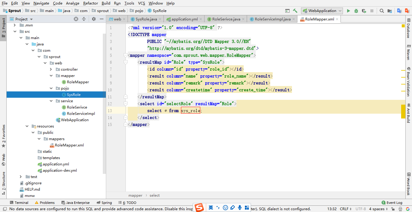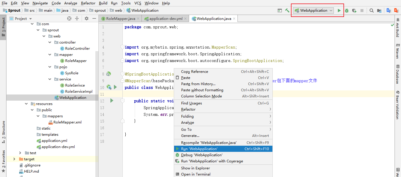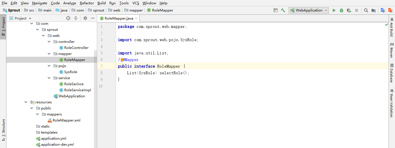 注意:@Mapper注解是让spring把RoleMapper文件管理起来(每个抽象类都需要加上@Mapper注解),还可以直接在启动类上面加上@MapperScan({"com.sprout.web.mapper"})注解,意思是扫描整个mapper包里面所有的Mapper文件