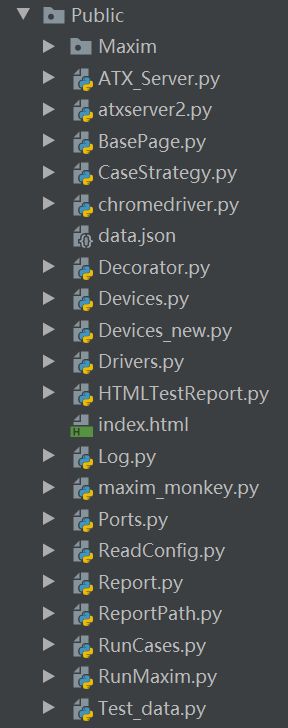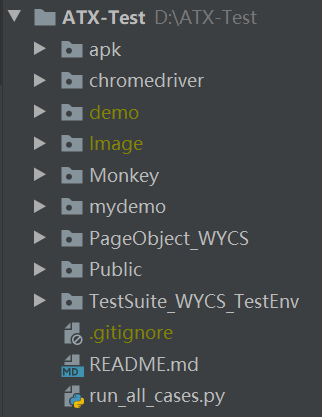 config.ini - 一些需要用到的数据,atx-server地址、测试设备的ip、测试数据等。此文件在此工程Public中已被删除,放到各测试用例套件TestSuite里,以分别支持不同测试项目的不同设置。 -
