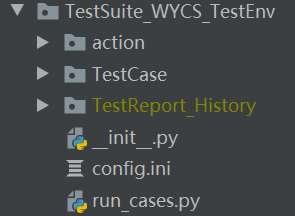 TestSuite_*是某个测试项目的测试套件。里面包含了测试操作集action,测试用例集TestCase,报告目录TestReport_History,项目配置文件config.ini,测试用例运行入口runcase.py。