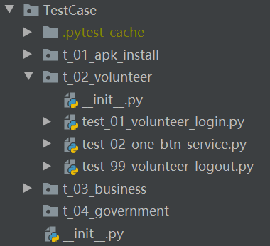 - 测试用例目录下也可以再新增目录进行测试用例集的划分。如图所示根据不同用户视角划分了几个用例集,用例集内的用例文件以功能来划分,例如安装,登录,登出等。