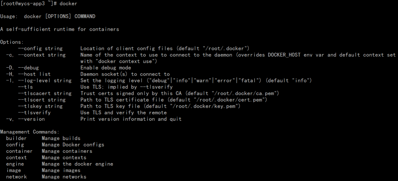 安装完成后运行docker,如下图所示输出一堆参数则说明安装成功。