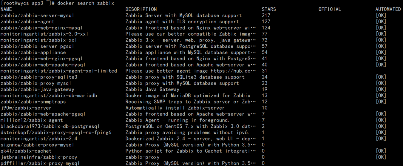 运行 docker search zabbix,如图所示显示了一些打包了zabbix的容器镜像。我们使用官方镜像来进行安装,可以自行挑选需要的组件镜像,此处挑选了一些必要的镜像,包括mysql版的zabbix server,zabbix agent,和web服务Nginx。