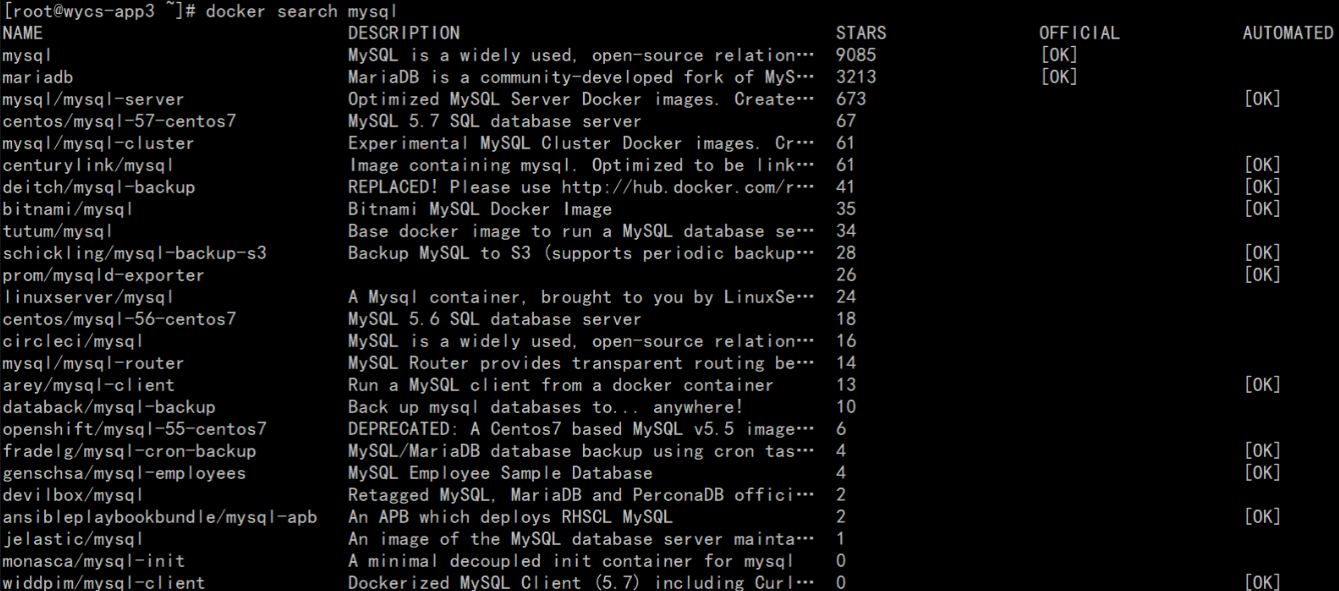 运行docker search mysql,如图所示为包含了mysql的容器镜像。