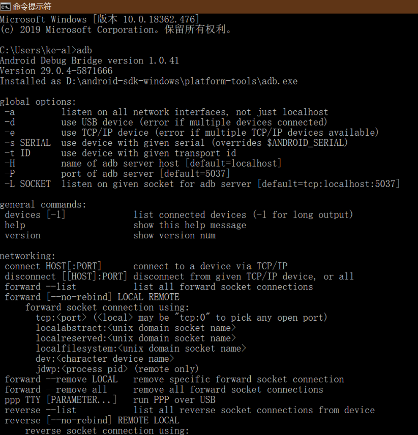 在命令行界面输入adb,看见如图所示一长串输出即说明安装成功。