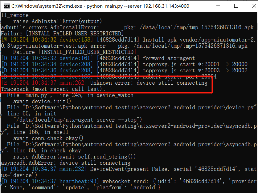 如图所示提示 adb device still connecting,可能有多种原因造成,可以使用以下几种方法尝试解决: