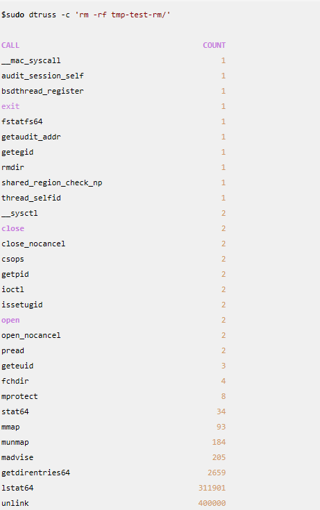 - 过程:正式删除工作的第一阶段,需要通过getdirentries64调用,分批读取目录(每次大约为4K),在内存中建立rm的文件列表;第二阶段,lstat64确定所有文件的状态;第三阶段,通过unlink执行实际删除。这三个阶段都有比较多的系统调用和文件系统操作。