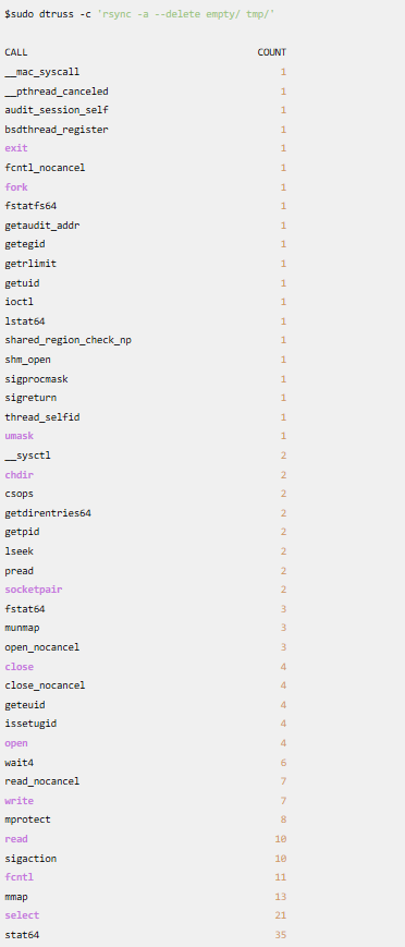 统计syscall使用了dtruss工具,这是MacOSX上提供的syscall调试工具,基于DTrace。Linux上可以使用SystemTap来代替。
