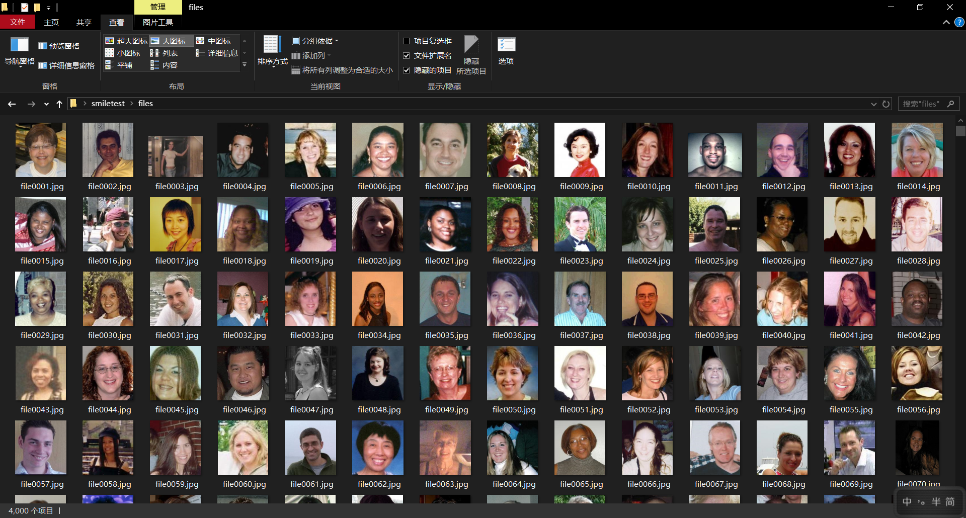 数据集包括4000张不同大小的像素的面部图像,通过人脸识别68个特征点检测数据库(shape_predictor_68_face_landmarks.dat)进一步确定人脸大小,将具有笑脸特征的图像转化为150×150像素保存在一个文件夹内。