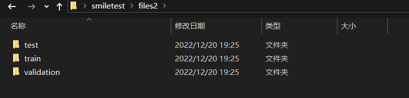 1 import os, shutil 2 3 # 原始数据集路径 4 original_dataset_dir = 'E:\\smiletest\\files1' 5 6 # 新的数据集 7 base_dir = 'E:\\smiletest\\files2'\ 8 # 创建文件夹 9 os.mkdir(base_dir) 10 11 # 训练图像、验证图像、测试图像的目录 12 train_dir = os.path.join(base_dir, 'train') 13 os.mkdir(train_dir) 14 validation_dir = os.path.join(base_dir, 'validation') 15 os.mkdir(validation_dir) 16 test_dir = os.path.join(base_dir, 'test') 17 os.mkdir(test_dir) 18 19 train_smiles_dir = os.path.join(train_dir, 'smile') 20 os.mkdir(train_smiles_dir) 21 22 train_unsmiles_dir = os.path.join(train_dir, 'unsmile') 23 os.mkdir(train_unsmiles_dir) 24 25 validation_smiles_dir = os.path.join(validation_dir, 'smile') 26 os.mkdir(validation_smiles_dir) 27 28 validation_unsmiles_dir = os.path.join(validation_dir, 'unsmile') 29 os.mkdir(validation_unsmiles_dir) 30 31 test_smiles_dir = os.path.join(test_dir, 'smile') 32 os.mkdir(test_smiles_dir) 33 34 test_unsmiles_dir = os.path.join(test_dir, 'unsmile') 35 os.mkdir(test_unsmiles_dir) 36 37 # 复制900张笑脸图片到train_smiles_dir 38 fnames = ['file{}.jpg'.format(i) for i in range(1, 900)] 39 for fname in fnames: 40 src = os.path.join(original_dataset_dir, fname) 41 dst = os.path.join(train_smiles_dir, fname) 42 shutil.copyfile(src, dst) 43 # 复制450张笑脸图片到validation_smiles_dir 44 fnames = ['file{}.jpg'.format(i) for i in range(900, 1350)] 45 for fname in fnames: 46 src = os.path.join(original_dataset_dir, fname) 47 dst = os.path.join(validation_smiles_dir, fname) 48 shutil.copyfile(src, dst) 49 50 # 复制450张笑脸图片到test_smiles_dir 51 fnames = ['file{}.jpg'.format(i) for i in range(1350, 1800)] 52 for fname in fnames: 53 src = os.path.join(original_dataset_dir, fname) 54 dst = os.path.join(test_smiles_dir, fname) 55 shutil.copyfile(src, dst) 56 57 # 复制873张笑脸图片到train_unsmiles_dir 58 fnames = ['file{}.jpg'.format(i) for i in range(2127, 3000)] 59 for fname in fnames: 60 src = os.path.join(original_dataset_dir, fname) 61 dst = os.path.join(train_unsmiles_dir, fname) 62 shutil.copyfile(src, dst) 63 64 # 复制878张笑脸图片到validation_unsmiles_dir 65 fnames = ['file{}.jpg'.format(i) for i in range(3000, 3878)] 66 for fname in fnames: 67 src = os.path.join(original_dataset_dir, fname) 68 dst = os.path.join(validation_unsmiles_dir, fname) 69 shutil.copyfile(src, dst)