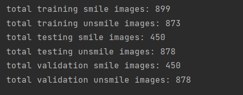 1 print('total training smile images:', len(os.listdir(train_smiles_dir))) 2 print('total training unsmile images:', len(os.listdir(train_unsmiles_dir))) 3 print('total testing smile images:', len(os.listdir(test_smiles_dir))) 4 print('total testing unsmile images:', len(os.listdir(test_unsmiles_dir))) 5 print('total validation smile images:', len(os.listdir(validation_smiles_dir))) 6 print('total validation unsmile images:', len(os.listdir(validation_unsmiles_dir)))