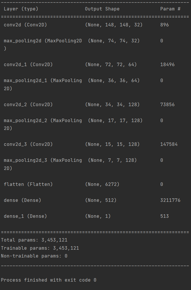 1 from keras import layers 2 from keras import models 3 #创建模型 4 model = models.Sequential() 5 #第一个卷积层作为输入层,32个3*3卷积核 6 #输出尺寸:150-3+1=148*148,参数数量:32*3*3*3+32=896 7 model.add(layers.Conv2D(32, (3, 3), activation='relu',input_shape=(150, 150, 3))) 8 model.add(layers.MaxPooling2D((2, 2))) 9 #输出尺寸:74-3+1=72*72,对应数量:64*3*3*32+64=18496 10 model.add(layers.Conv2D(64, (3, 3), activation='relu')) 11 model.add(layers.MaxPooling2D((2, 2))) 12 #输出尺寸:36-3+1=34*34,对应数量:128*3*3*64+128=73856 13 model.add(layers.Conv2D(128, (3, 3), activation='relu')) 14 model.add(layers.MaxPooling2D((2, 2))) 15 #输出尺寸:17-3+1=15*15,对应数量:128*3*3*128+128=147584 16 model.add(layers.Conv2D(128, (3, 3), activation='relu')) 17 model.add(layers.MaxPooling2D((2, 2))) 18 model.add(layers.Flatten()) 19 model.add(layers.Dense(512, activation='relu')) 20 model.add(layers.Dense(1, activation='sigmoid')) 21 model.summary()#查看标量信息
