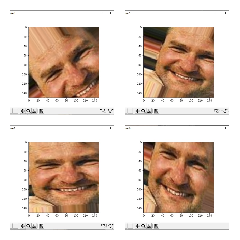 1 from keras import layers 2 from keras import models 3 from keras import optimizers 4 from keras.preprocessing.image import ImageDataGenerator 5 import os, shutil 6 #数据增强 7 datagen = ImageDataGenerator( 8 rotation_range=40, 9 width_shift_range=0.2, 10 height_shift_range=0.2, 11 shear_range=0.2, 12 zoom_range=0.2, 13 horizontal_flip=True, 14 fill_mode='nearest') 15 #数据增强后图片变化 16 import matplotlib.pyplot as plt 17 # from keras.preprocessing import image 18 from keras.utils import image_utils 19 train_smile_dir='E:\\smiletest\\files2\\train\\smile' 20 fnames = [os.path.join(train_smile_dir, fname) for fname in os.listdir(train_smile_dir)] 21 img_path = fnames[3] 22 img = image_utils.load_img(img_path, target_size=(150, 150)) 23 x = image_utils.img_to_array(img) 24 x = x.reshape((1,) + x.shape) 25 i = 0 26 for batch in datagen.flow(x, batch_size=1): 27 plt.figure(i) 28 imgplot = plt.imshow(image_utils.array_to_img(batch[0])) 29 i += 1 30 if i % 4 == 0: 31 break 32 plt.show()
