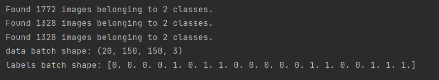 1 from keras import layers 2 from keras import models 3 from keras import optimizers 4 #统一化 5 model.compile(loss='binary_crossentropy', 6 optimizer=optimizers.RMSprop(lr=1e-4), 7 metrics=['acc']) 8 train_datagen = ImageDataGenerator(rescale=1./255) 9 validation_datagen=ImageDataGenerator(rescale=1./255) 10 test_datagen = ImageDataGenerator(rescale=1./255) 11 train_generator = train_datagen.flow_from_directory( 12 # 目标文件目录 13 train_dir, 14 #所有图片的size必须是150x150 15 target_size=(150, 150), 16 batch_size=20, 17 class_mode='binary') 18 validation_generator = test_datagen.flow_from_directory( 19 validation_dir, 20 target_size=(150, 150), 21 batch_size=20, 22 class_mode='binary') 23 test_generator = test_datagen.flow_from_directory(test_dir, 24 target_size=(150, 150), 25 batch_size=20, 26 class_mode='binary') 27 for data_batch, labels_batch in train_generator: 28 print('data batch shape:', data_batch.shape) 29 print('labels batch shape:', labels_batch) 30 break
