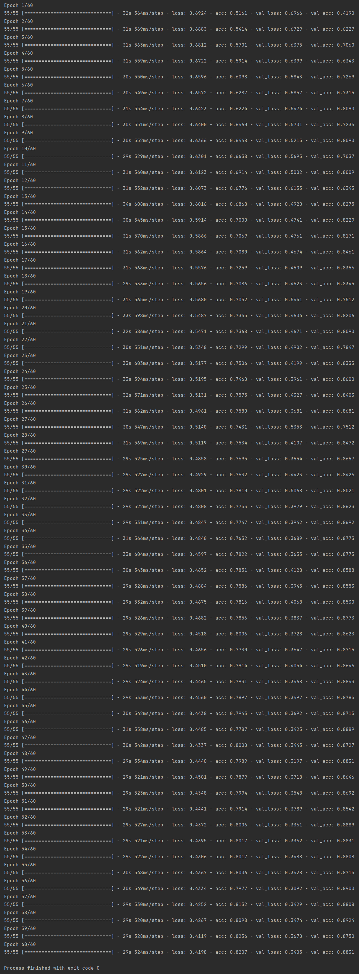 1 from keras import layers 2 from keras import models 3 from keras import optimizers 4 import matplotlib.pyplot as plt 5 #创建网络 6 from keras.preprocessing.image import ImageDataGenerator 7 8 model = models.Sequential() 9 model.add(layers.Conv2D(32, (3, 3), activation='relu',input_shape=(150, 150, 3))) 10 model.add(layers.MaxPooling2D((2, 2))) 11 model.add(layers.Conv2D(64, (3, 3), activation='relu')) 12 model.add(layers.MaxPooling2D((2, 2))) 13 model.add(layers.Conv2D(128, (3, 3), activation='relu')) 14 model.add(layers.MaxPooling2D((2, 2))) 15 model.add(layers.Conv2D(128, (3, 3), activation='relu')) 16 model.add(layers.MaxPooling2D((2, 2))) 17 model.add(layers.Flatten()) 18 model.add(layers.Dropout(0.5)) 19 model.add(layers.Dense(512, activation='relu')) 20 model.add(layers.Dense(1, activation='sigmoid')) 21 model.compile(loss='binary_crossentropy', 22 optimizer=optimizers.RMSprop(lr=1e-4), 23 metrics=['acc']) 24 25 #统一化处理 26 train_datagen = ImageDataGenerator( 27 rescale=1./255, 28 rotation_range=40, 29 width_shift_range=0.2, 30 height_shift_range=0.2, 31 shear_range=0.2, 32 zoom_range=0.2, 33 horizontal_flip=True,) 34 35 test_datagen = ImageDataGenerator(rescale=1./255) 36 train_dir = 'E:\\smiletest\\files2\\train' 37 validation_dir='E:\\smiletest\\files2\\validation' 38 train_generator = train_datagen.flow_from_directory( 39 # This is the target directory 40 train_dir, 41 # All images will be resized to 150x150 42 target_size=(150, 150), 43 batch_size=32, 44 # Since we use binary_crossentropy loss, we need binary labels 45 class_mode='binary') 46 47 validation_generator = test_datagen.flow_from_directory( 48 validation_dir, 49 target_size=(150, 150), 50 batch_size=32, 51 class_mode='binary') 52 53 history = model.fit_generator( 54 train_generator, 55 steps_per_epoch=55, 56 epochs=60, 57 validation_data=validation_generator, 58 validation_steps=27)