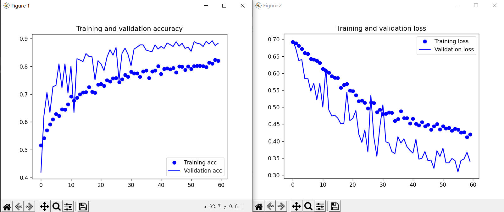 1 import matplotlib.pyplot as plt 2 #数据增强过后的训练集与验证集的精确度与损失度的图形 3 acc = history.history['acc'] 4 val_acc = history.history['val_acc'] 5 loss = history.history['loss'] 6 val_loss = history.history['val_loss'] 7 8 epochs = range(len(acc)) 9 # 输出精度度曲线图与散点图 10 plt.plot(epochs, acc, 'bo', label='Training acc') 11 plt.plot(epochs, val_acc, 'b', label='Validation acc') 12 plt.title('Training and validation accuracy') 13 plt.legend() 14 plt.figure() 15 # 输出损失曲线图与散点图 16 plt.plot(epochs, loss, 'bo', label='Training loss') 17 plt.plot(epochs, val_loss, 'b', label='Validation loss') 18 plt.title('Training and validation loss') 19 plt.legend() 20 plt.show()