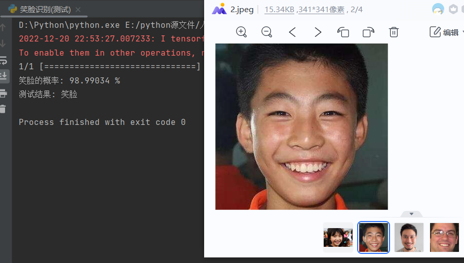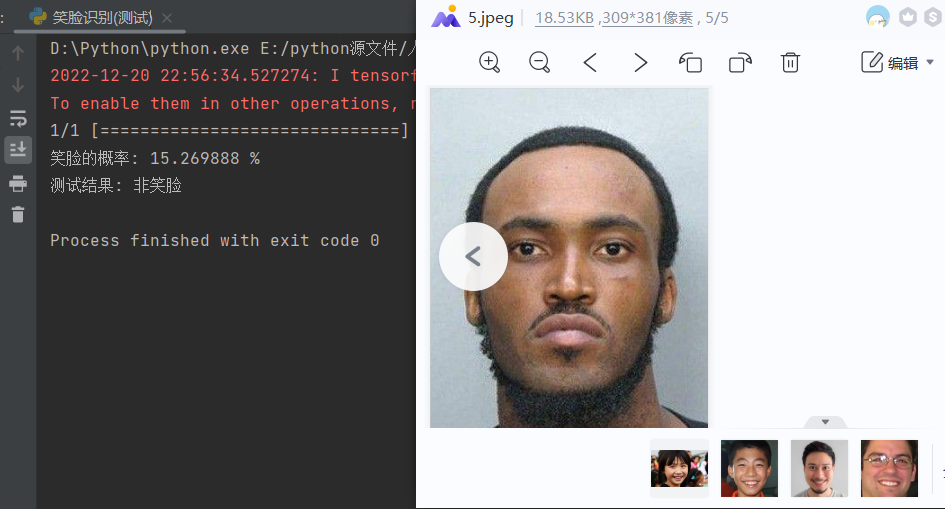 1 # import cv2 2 # from keras.preprocessing import image 3 from keras.utils import image_utils 4 from keras.models import load_model 5 import numpy as np 6 # 单张图片进行判断是笑脸还是非笑脸 7 # 加载模型 8 model = load_model('E:\\smiletest\\smileAndunsmile1.h5') 9 # 本地图片路径 10 img_path = 'E:\\smiletest\\testimg\\2.jpeg' 11 img = image_utils.load_img(img_path, target_size=(150, 150)) 12 13 img_tensor = image_utils.img_to_array(img) / 255.0 14 img_tensor = np.expand_dims(img_tensor, axis=0) 15 prediction = model.predict(img_tensor) 16 prediction1=str((1-prediction)*100).strip('[]') 17 # (1-prediction1)*100 18 print('笑脸的概率:',prediction1,'%') 19 if prediction[0][0] > 0.5: 20 result = '非笑脸' 21 else: 22 result = '笑脸' 23 print('测试结果:',result)