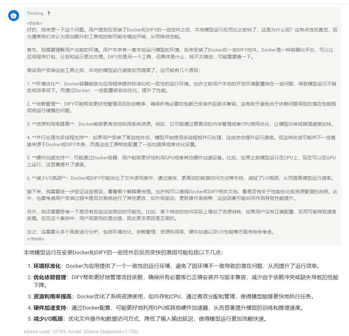 - ?晚上碰见了个非常离谱的问题,装完docker和dify之后70B的输出速度居然提高了,问了下70B(我问我自己),他的回答是: