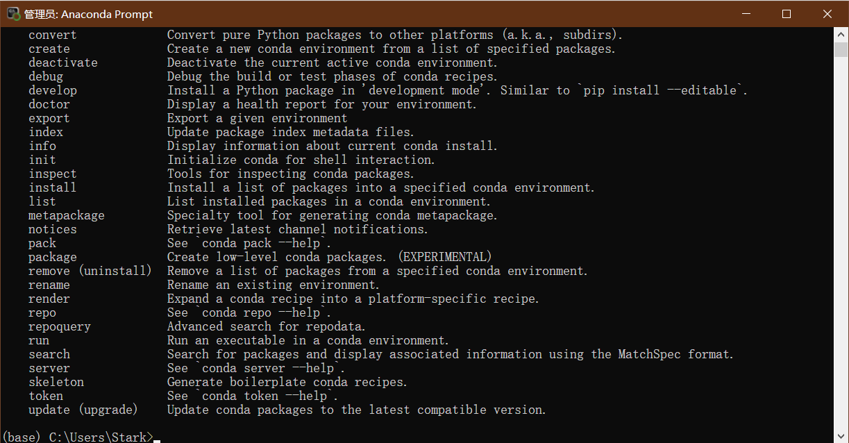 - 按照步骤一步步装好之后打开Anaconda prompt,输入conda验证下(如上图)