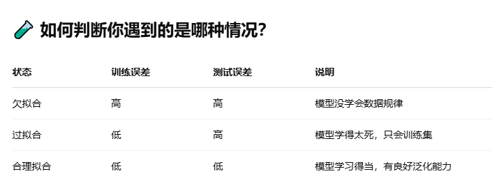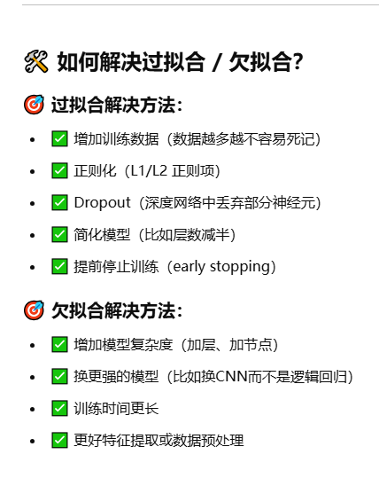 - 欠拟合:模型啥也没学明白,准确率低,连训练集都搞不明白,狗和猫分辨不出来,问题在于模型过于简单,结合图形就是训练集作为一些点,模型直接是一条直线,没有穿过这些点或者特别少