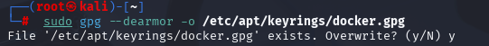 curl -fsSL https://download.docker.com/linux/debian/gpg | sudo gpg --dearmor -o /usr/share/keyrings/docker-archive-keyring.gpg- 这一步会:下载 GPG 公钥;用 gpg --dearmor转换为二进制格式;存储在 Kali 系统推荐的路径:/usr/share/keyrings/ 中。