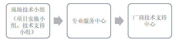 现场技术小组:属于一线工程实施或者技术支持人员,是我公司派驻用户管理现场的技术小组。技术小组按照《标准化服务流程》和《系统网络管理规范》中的工作要求,进行项目实施和管理,以及受用户委托管理相关网络、主机和应用系统。技术小组成员都接受过严格的专业训练,能够立即处理用户现场绝大部分问题。如果遇到尚不清楚、无法解决的技术问题,小组在最短时间内将其转交给专业服务中心处理。