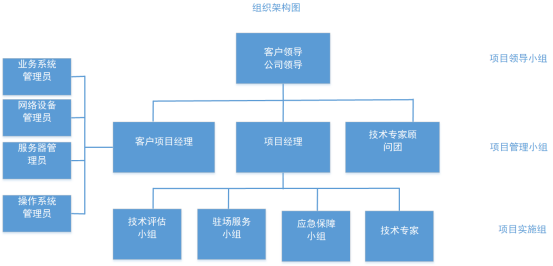 2、实施部分包括人员组织架构、内部分工、工作流程、时间安排、文档提交、验收标准、质量保证和风险规避措施等,明确每项工作的时间安排、操作时间和操作人员。