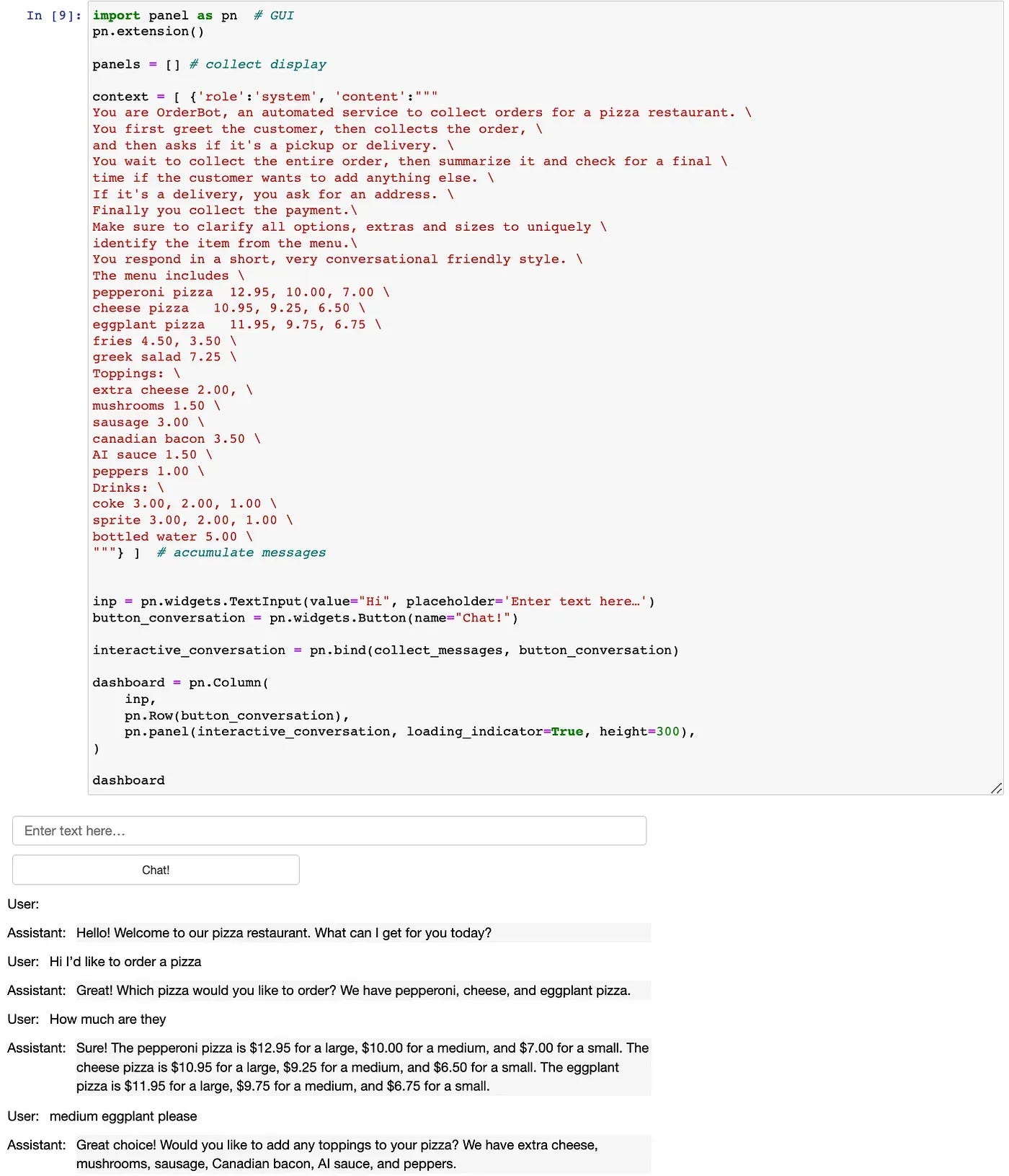最后,设置和执行用户界面来显示OrderBot。上下文中包含系统消息,其中包含菜单,它在与语言模型的每次交互中保持一致。随着更多的交互发生,上下文不断发展,保持全面的对话记录。