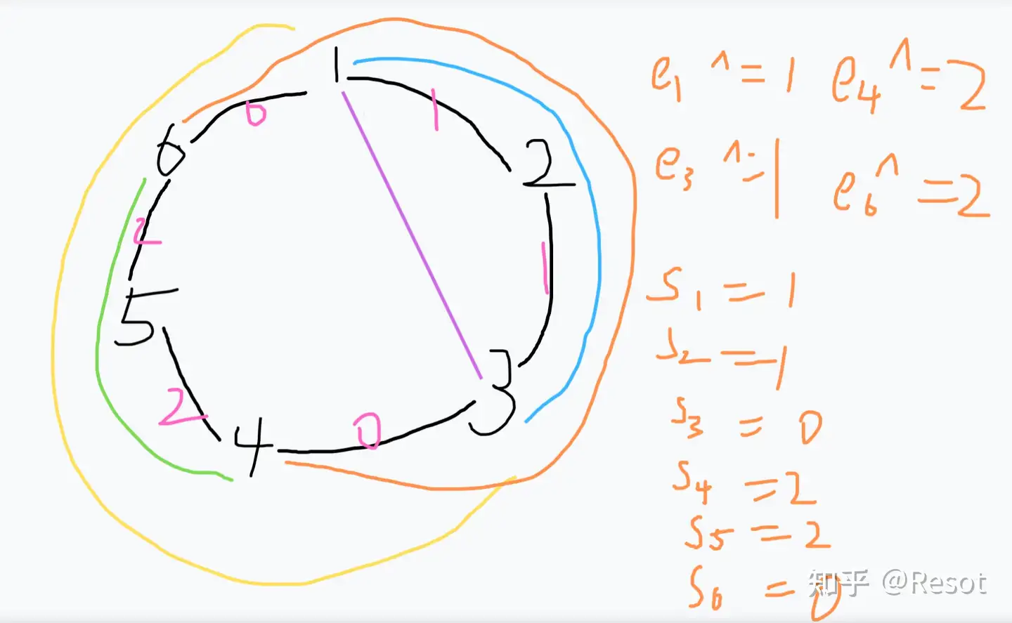 因为是异或的随机值,我们对优弧染上了 \(x\), 我们对优弧染上了 \(x\), 对劣弧染上了 \(y\),然后整个圈都同事异或 \(y\),相当于优弧染上了 \(x \oplus y\), 劣弧染了 \(0\), 因为是随机的异或值, 所以 \(x \oplus y\) 可以直接相当于 \(x\).