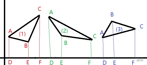 如上图, 将每个点投影到 x 轴上, 那么根据容斥, \(\rm{S}_{\triangle ABC} = S_{ADFC} - S_{ABED} - S_{BCFE}\).