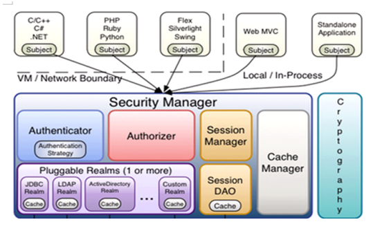 三个核心组件:Subject, SecurityManager 和 Realms: