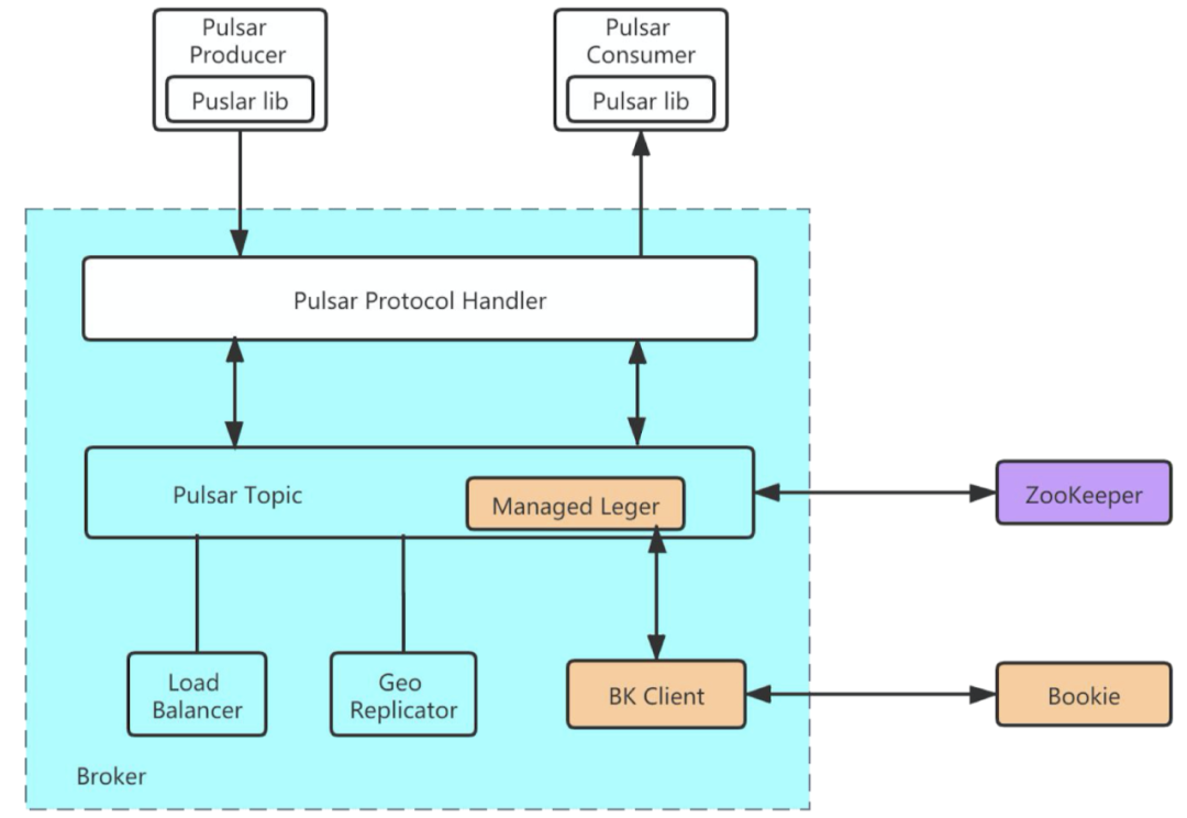 在 Pulsar 架构中,基于 Managed Leger 已经实现了一套分布式的流程封装,包括如何去存储消息和防止消息丢失。Broker 本身也实现了一些特性,比如 load-balancer、geo-replicator 等。