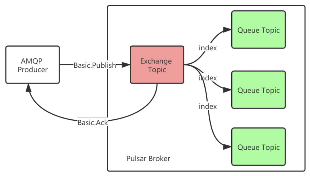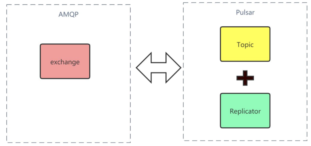 AmqpExchange 包含一个原始消息 Topic,用来保存 AMQP producer 发送的消息。AmqpExchange 的 replicator 会将消息处理到 AMQP 队列中。Replicator 是基于 Pulsar 的持久化游标,可以确保成功将消息发送到队列,而不会丢失消息。