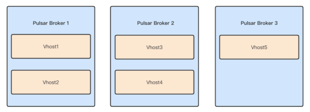 在 AoP 中,一个 Vhost 基于一个 Pulsar namespace,并且这个 namespace 只能有一个 bundle。如果一台 broker 崩溃,其他的 broker 可以接管这台崩溃的 broker 维护的 Vhost。Vhost 也可以利用 broker 的负载均衡机制。broker 可以将 Vhost 从一台高负载的机器转移到一台空闲的机器。下图展示了 Vhost 在 broker 上的分配情况。