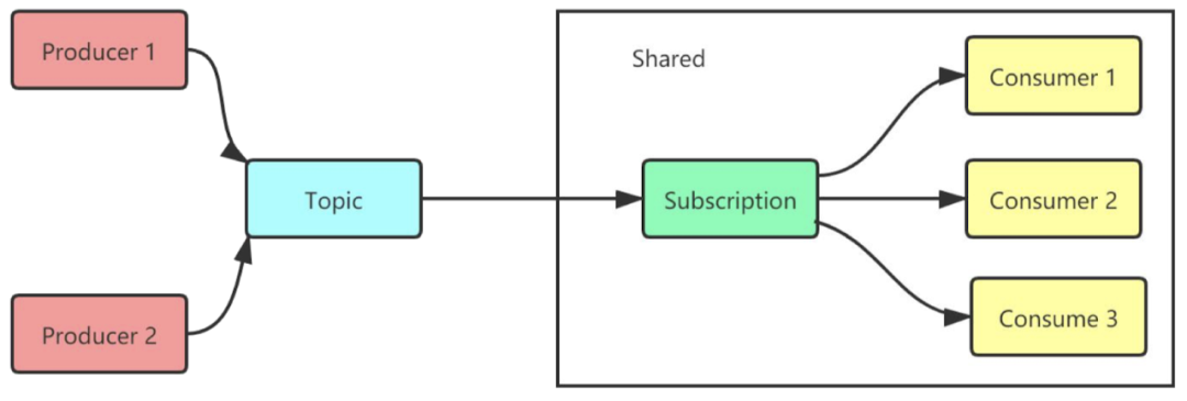 Shared(共享订阅)是可以将所需数量的 consumer 附加到同一订阅。消息以多个 consumer 的循环尝试分发形式传递,并且任何给定的消息仅传递给一个 consumer。当消费者断开连接时,所有传递给它并且未被确认的消息将被重新安排,以便发送给该订阅上剩余的 consumer。